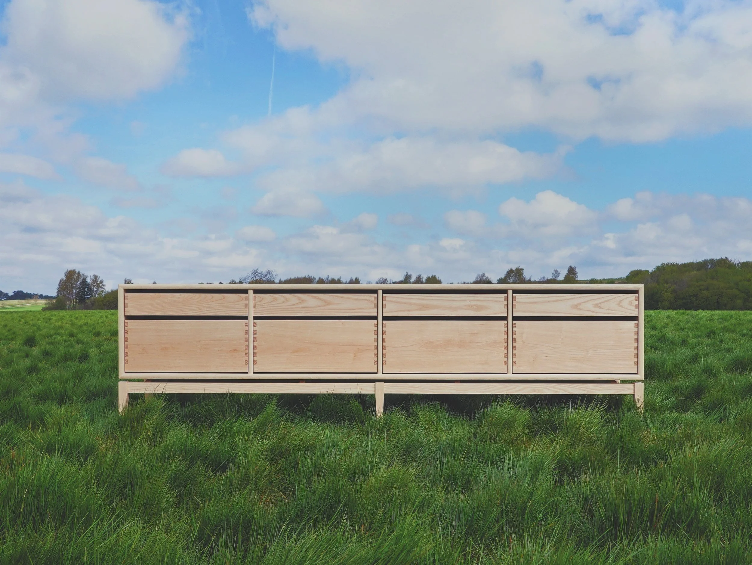 Den lange skænk er lavet på bestilling så den passer til kundens stue. De massive skuffefronter er lavet af den samme planke så der er forløb i åretegningen.